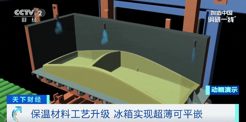 預(yù)裝完成后,車間里的裝備會(huì)將保溫材料填充進(jìn)冰箱外殼與內(nèi)膽之間的腔體。保溫材料就像一層“羽絨服”,能夠隔絕冰箱內(nèi)外的熱量交換,讓冰箱內(nèi)部始終保持低溫。過去,保溫材料用的是聚氨酯泡沫,需要填充比較厚的一層,才能達(dá)到理想的保溫效果。如今,技術(shù)進(jìn)步,讓填充層的厚度減少到3至4厘米,相當(dāng)于給冰箱穿上一件更加輕薄、保暖效果出色的“羽絨服”。如今,市面上出現(xiàn)了很多整體厚度不到60厘米,能夠完美嵌入家用櫥柜的冰箱,正是得益于這項(xiàng)生產(chǎn)技術(shù)的進(jìn)步。